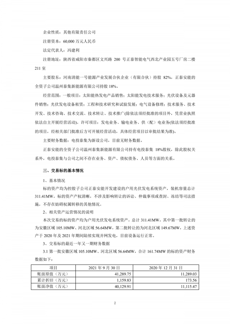 1月25日,正泰電器發(fā)布公告稱(chēng),將其所持有的河北及安徽區(qū)域總計(jì)311.41MW戶(hù)用光伏發(fā)電系統(tǒng)資產(chǎn)分兩批轉(zhuǎn)讓給陜西電投泰集新能源科技有限公司,交易對(duì)價(jià)總計(jì)為124749.41萬(wàn)元。