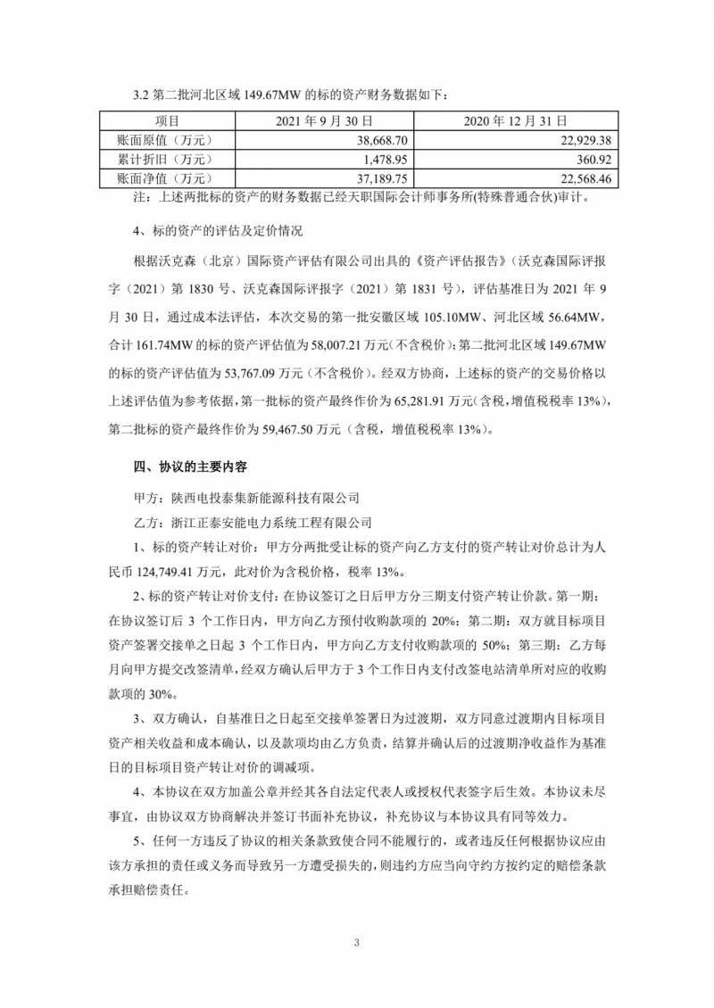 根據(jù)交易公告,正泰安能與電投泰集簽訂資產(chǎn)收購(gòu)協(xié)議,將其所持有的河北及安徽區(qū)域總計(jì)311.41MW戶(hù)用光伏發(fā)電系統(tǒng)資產(chǎn)分兩批轉(zhuǎn)讓給電投泰集,交易對(duì)價(jià)總計(jì)為124749.41萬(wàn)元(均為含稅價(jià),增值稅稅率13%);其中第一批轉(zhuǎn)讓安徽區(qū)域 105.10MW、河北區(qū)域56.64MW,合計(jì)161.74MW,交易對(duì)價(jià)為65281.91萬(wàn)元(含稅價(jià),增值稅稅率13%);第二批轉(zhuǎn)讓河北區(qū)域149.67MW,交易對(duì)價(jià)為59467.50萬(wàn)元(含稅價(jià),增值稅稅率13%)。上述資產(chǎn)交割完成后,正泰安能或其子公司將繼續(xù)為上述戶(hù)用光伏發(fā)電系統(tǒng)提供運(yùn)維服務(wù)。