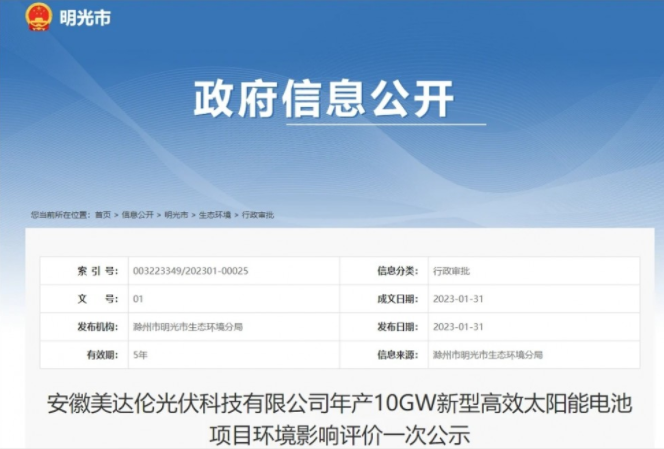 2023年1月31日,滁州市明光市生態(tài)環(huán)境分局發(fā)布了安徽美達(dá)倫光伏科技有限公司年產(chǎn)10GW新型高效太陽能電池項(xiàng)目環(huán)境影響評價(jià)一次公示,安徽省明光市產(chǎn)城新區(qū)擬建設(shè)年產(chǎn)10GW新型高效太陽能電池項(xiàng)目。
