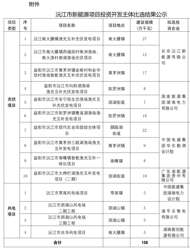 2月17日,湖南省沅江市人民政府下發(fā)《沅江市新能源項(xiàng)目投資開(kāi)發(fā)主體比選結(jié)果公示》,共下發(fā)了1.58GW,包含1.38GW光伏項(xiàng)目、0.2GW風(fēng)電項(xiàng)目。