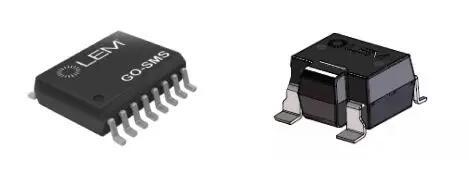 當(dāng)印刷電路板(Print Circuit Board)上用于電流測量的布板空間比較小時,理想情況是采用芯片式電流測量方案。將初級導(dǎo)體進(jìn)行集成,直接表面貼裝(Surface Mounted Device)到印刷電路板上,從而降低制造成本,同時也避免混淆各種焊接工藝。LEM 最新開發(fā)的GO-SMS(下圖左)/HMSR-SMS(下圖右) 系列電流傳感器均為SMD封裝的芯片式電流傳感器。
