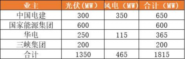 而在儲備項目庫中共9個項目,1.815GW。其中5個光伏項目,共計1.35GW;4個風(fēng)電項目共計465MW。中國電建650MW,國家能源集團規(guī)模600MW,華電365MW,三峽200MW。具體如下: