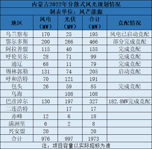 2021年6月,內(nèi)蒙古印發(fā)《內(nèi)蒙古自治區(qū)分散式風電、分布式光伏發(fā)電項目三年行動計劃(2021~2023年)》顯示,2022年內(nèi)蒙古規(guī)劃分散式風光容量為1.973GW,其中風電976MW,光伏997MW。