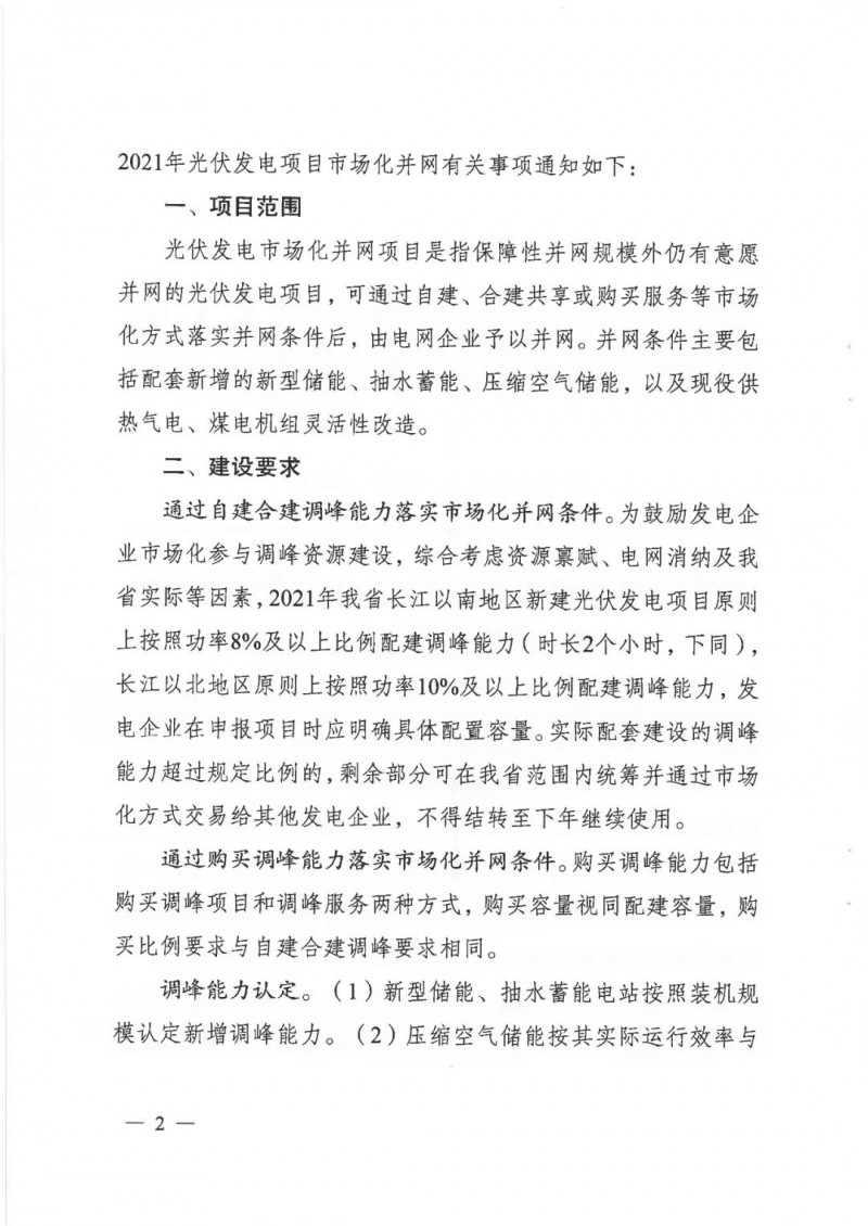 2021年落實(shí)市場(chǎng)化并網(wǎng)條件的光伏發(fā)電項(xiàng)目:原則上應(yīng)在2023年6月底前建成并網(wǎng)。配套新增調(diào)峰能力項(xiàng)目原則上應(yīng)為2021年1月1日以后投產(chǎn)的項(xiàng)目,應(yīng)與光伏發(fā)電項(xiàng)目同步建成、同步并網(wǎng),可在光伏發(fā)電項(xiàng)目所在地建設(shè),也可以異地建設(shè),但長江以北市場(chǎng)化并網(wǎng)的光伏發(fā)電項(xiàng)目所建設(shè)或購買的調(diào)峰能力原則上須在長江以北區(qū)域建成。