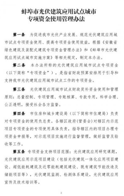 2月15日,安徽省蚌埠市住房和城鄉(xiāng)建設局發(fā)布《蚌埠市光伏建筑應用試點城市專項資金使用管理辦法》的通知。