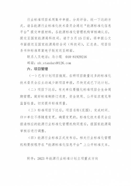 為進(jìn)一步提升能源行業(yè)標(biāo)準(zhǔn)立項(xiàng)工作的計(jì)劃性、導(dǎo)向性,根據(jù)國(guó)家能源局標(biāo)準(zhǔn)化工作安排,結(jié)合落實(shí)《能源碳達(dá)峰碳中和標(biāo)準(zhǔn)化提升行動(dòng)計(jì)劃》重點(diǎn)任務(wù),我局組織編制了《2023年能源行業(yè)標(biāo)準(zhǔn)計(jì)劃立項(xiàng)指南》?,F(xiàn)印發(fā)給你們,請(qǐng)按照指南明確的要求,做好能源行業(yè)標(biāo)準(zhǔn)計(jì)劃立項(xiàng)工作。