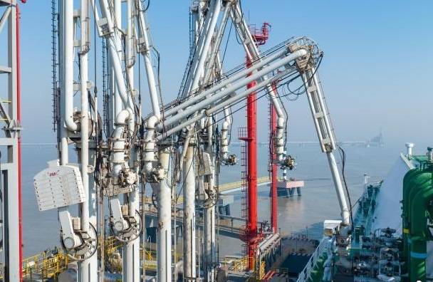 操作員正在連接LNG卸料臂,準(zhǔn)備接卸LNG?!〖敬禾?攝