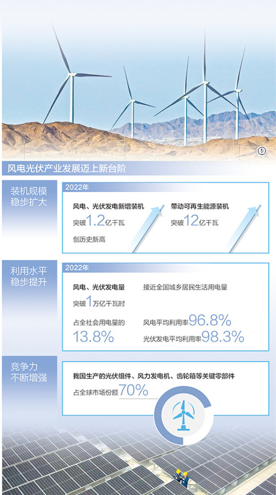 出口總額超過512億美元,同比增長80.3%——2022年,我國光伏產(chǎn)業(yè)在國際市場的表現(xiàn)亮眼。歷經(jīng)多年深耕細作,我國風電光伏產(chǎn)業(yè)競爭力大幅提升,光伏組件、風力發(fā)電機、齒輪箱等關(guān)鍵零部件占全球市場份額的比重提升至70%。在國內(nèi),風電光伏也已成為新增發(fā)電裝機和新增發(fā)電量的主體,2022年占比分別達到78%和55%以上,累計裝機突破7億千瓦,相當于30多個三峽電站。
