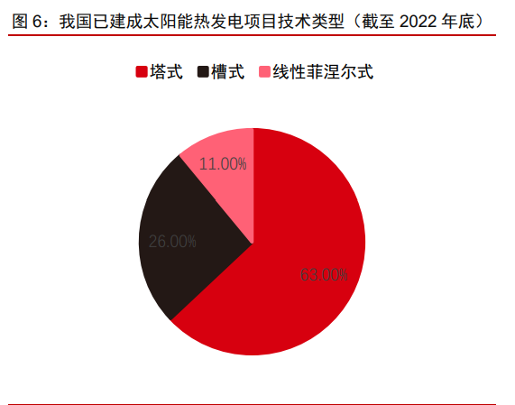我國已建成光熱項(xiàng)目中,塔式光熱占比相對(duì)較高。根據(jù) CSTA 數(shù)據(jù),截至 2021 年底, 全球太陽能熱發(fā)電累計(jì)裝機(jī)容量達(dá)到 6.8GW,槽式、塔式、線性菲涅耳技術(shù)裝機(jī)在全球主 要國家和地區(qū)的占比為 76%、20%和 4%。截至 2022 年底,我國太陽能熱發(fā)電累計(jì)裝機(jī) 容量為 588MW(含 MW 級(jí)以上規(guī)模的發(fā)電系統(tǒng)),塔式光熱電站雖然前期系統(tǒng)建設(shè)一次性投資較大且維護(hù)成本較高,但更適合我國西部地區(qū)晝夜溫差大、缺少水資源、自然環(huán)境 惡劣等特點(diǎn),同時(shí)因槽式系統(tǒng)和線菲式系統(tǒng)集熱效率偏低、對(duì)工質(zhì)加熱能力較弱等因素, 因而在我國塔式光熱電站應(yīng)用范圍相對(duì)較廣。