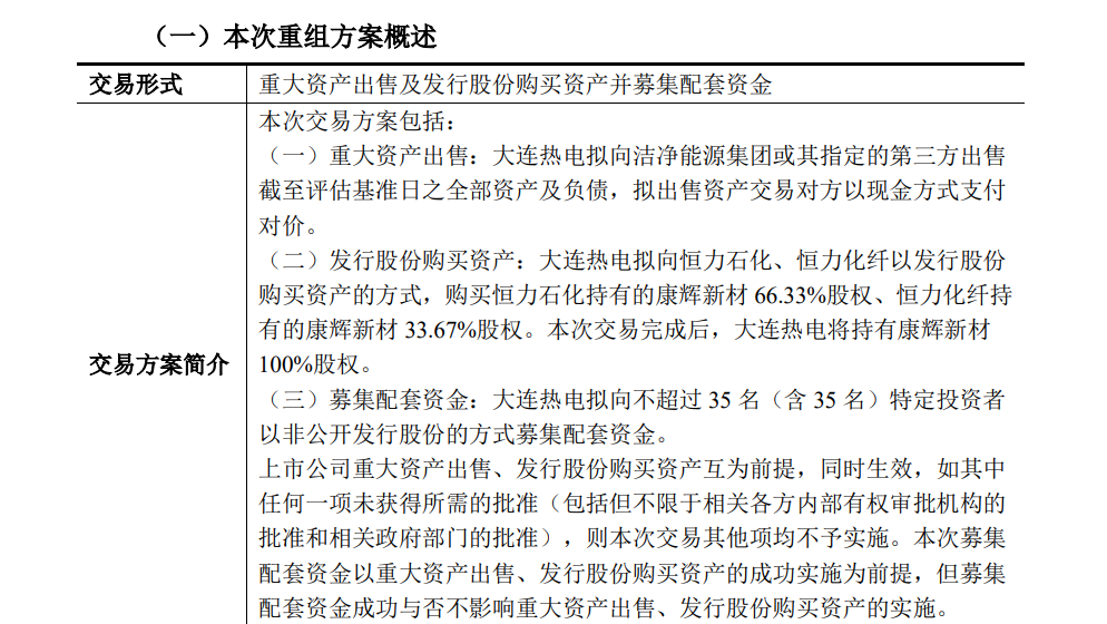 交易完成后,這將成為A股市場首例由民企上市公司主導(dǎo)的“分拆+重組”案例,可謂創(chuàng)造了歷史。目前恒力石化總市值1014億元,大連熱電總市值19.62億元,本次交易恒力石化擬通過以公司及子公司恒力化纖共同持有的康輝新材100%股權(quán)認(rèn)購大連熱電非公開發(fā)行股份等方式,實現(xiàn)全資子公司康輝新材重組上市。大連熱電擬以發(fā)行股份購買資產(chǎn)的方式,購買恒力石化持有的康輝新材66.33%股權(quán)、恒力化纖持有的康輝新材33.67%股權(quán),具體方案如下。