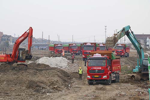 2月21日,工人們戴著口罩在工地上進(jìn)行作業(yè)、挖掘機(jī)忙著挖掘碎石和泥塊,渣土車來(lái)來(lái)往往清運(yùn)著石料……繁忙的景象打破了多日沉寂,由中國(guó)安能第二工程局常州分公司承建的新孟河延伸拓浚工程常州新北區(qū)河道八標(biāo)段正式復(fù)工。