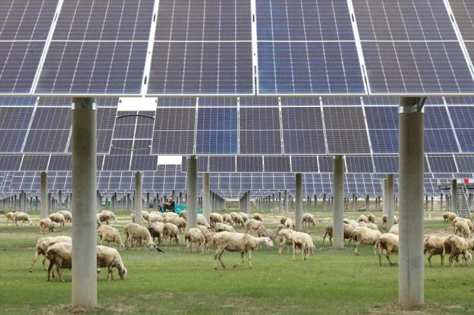 7月11日,在張家口市康??h張紀鎮(zhèn),羊群在光伏板下覓食。新華社記者 楊世堯 攝
