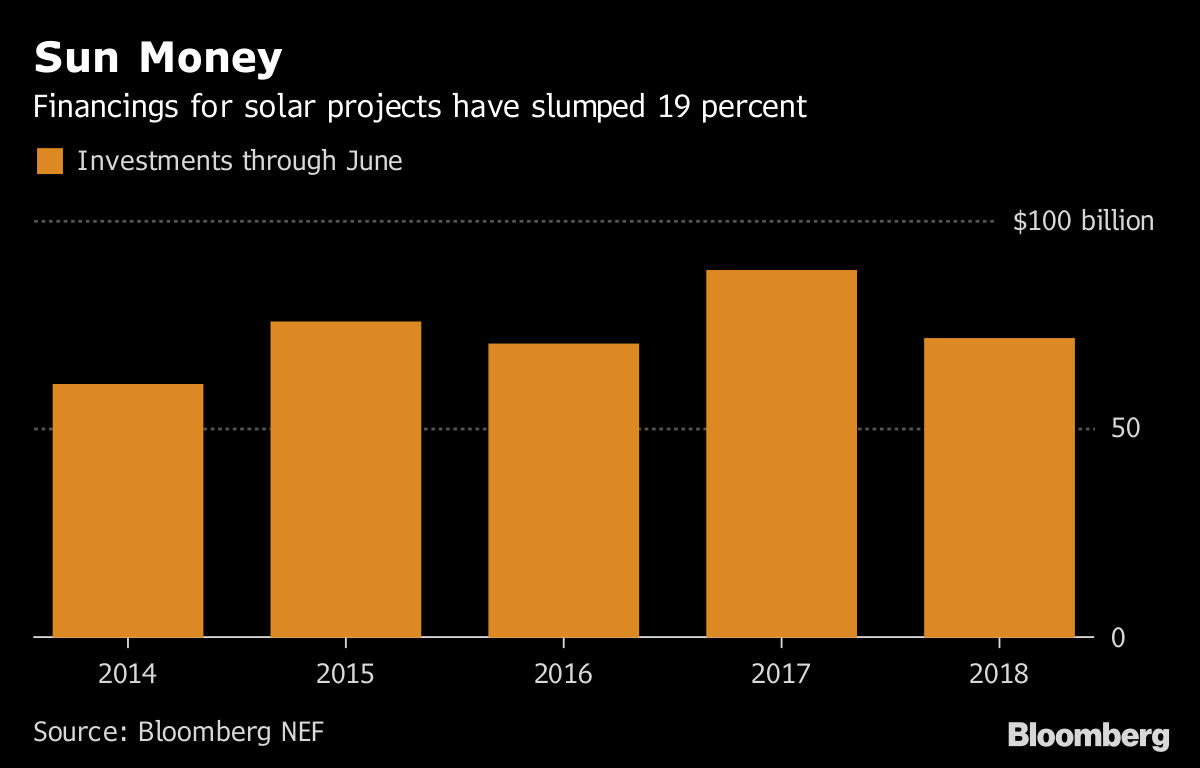 但中國并不是太陽能投資滯后的唯一原因。太陽能電池板的平均價(jià)格在去年下降了19%。這意味著太陽能發(fā)電場建設(shè)成本更低,因此需要的投資降低。