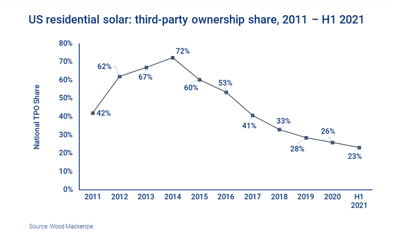 Sunrun公司鞏固了其作為最大TPO供應(yīng)商的地位,在2021年上半年擁有68%的TPO市場(chǎng)份額。在可預(yù)見(jiàn)的未來(lái)也將如此,一部分原因是該公司收購(gòu)了Vivint Solar(前第二大TPO供應(yīng)商),該收購(gòu)于2020年第四季度完成。