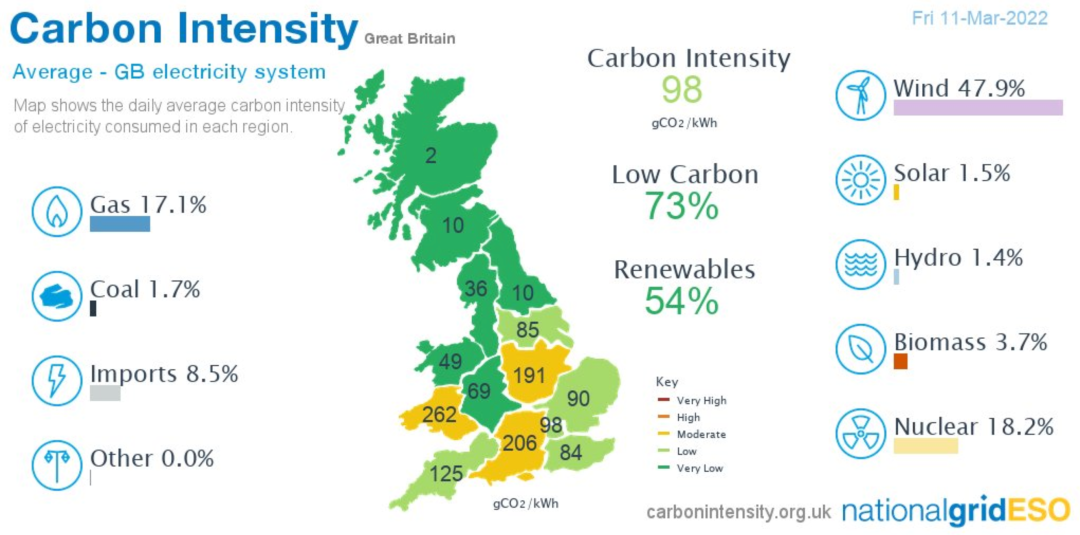 這一天,可再生能源發(fā)電占比達到54%,發(fā)電的碳排放強度為98克/千瓦時。