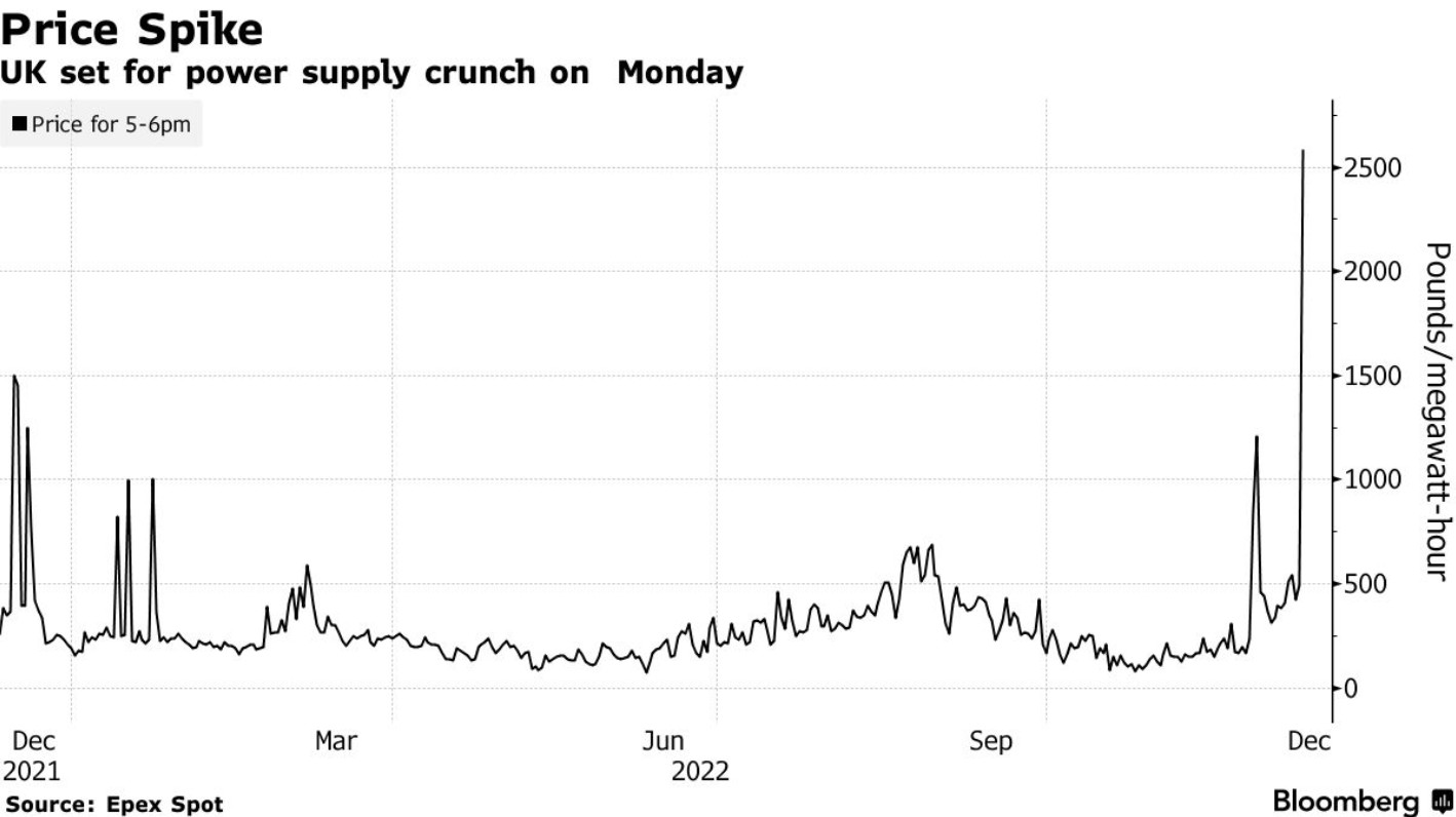 由于寒冷的氣溫將導(dǎo)致電力需求激增,再加上風(fēng)力發(fā)電量下降導(dǎo)致供應(yīng)短缺,英國電力價(jià)格周一飆升至創(chuàng)紀(jì)錄水平。據(jù)數(shù)據(jù)顯示,英國電力價(jià)格日前以創(chuàng)紀(jì)錄的每兆瓦時(shí)674.78英鎊結(jié)算,而周一電力價(jià)格則創(chuàng)下每兆瓦時(shí)2585.80英鎊的歷史新高。