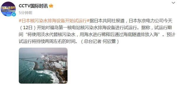 據(jù)日本共同社報(bào)道,日本東京電力公司今天(6月12日)開(kāi)始對(duì)福島第一核電站核污染水排海設(shè)備進(jìn)行試運(yùn)行。據(jù)稱(chēng),試運(yùn)行期間“將使用淡水代替核污染水,用海水進(jìn)行稀釋后通過(guò)海底隧道排放入海”。預(yù)計(jì)試運(yùn)行將持續(xù)兩周左右的時(shí)間。