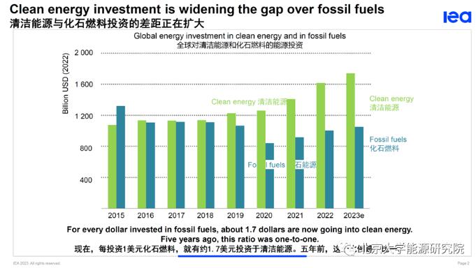 近日,國際能源署《2023世界能源投資》報告在北京發(fā)布。國際能源署首席能源經(jīng)濟(jì)學(xué)家Tim Gould介紹,五年前,清潔能源與化石能源的投資比為1:1,如今這一比例已擴(kuò)大至1.7:1。同時,太陽能領(lǐng)域的投資將會在2023年首次超過石油生產(chǎn)投資。