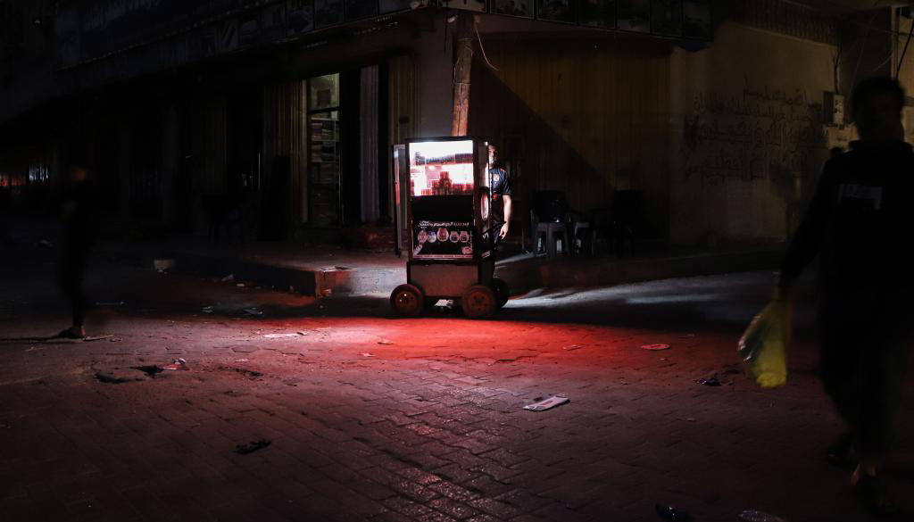 當(dāng)?shù)貢r(shí)間2023年10月16日,加沙地帶的汗尤尼斯,黑暗中的小商販。