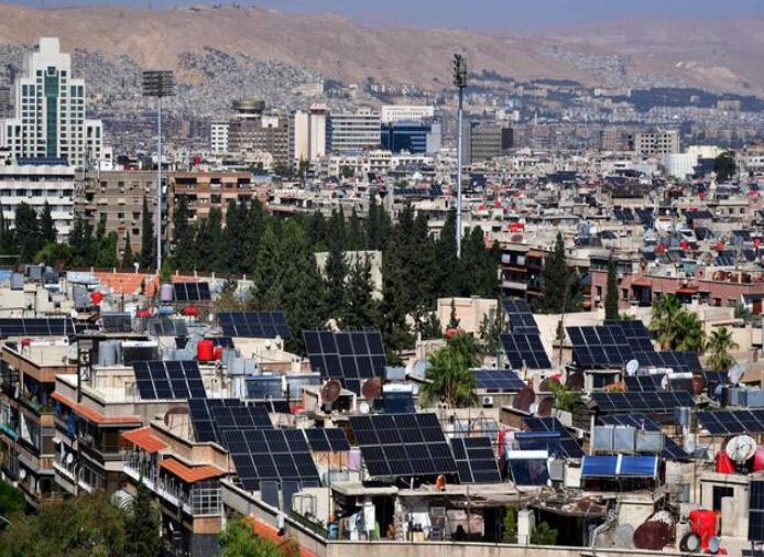 10月25日,在敘利亞首都大馬士革,一些房屋的頂上架設(shè)著太陽能光伏發(fā)電板。