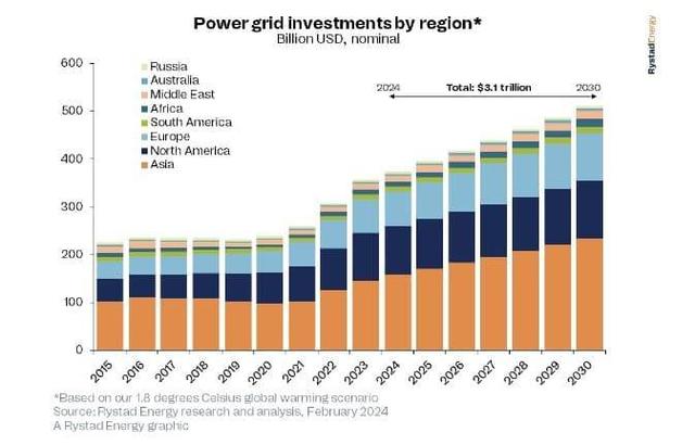 可再生能源的發(fā)展仍在以驚人的速度進(jìn)行,2024年將有6440億美元用于新增產(chǎn)能,但過時(shí)和不足的電網(wǎng)可能會成為能源轉(zhuǎn)型的重大障礙。根據(jù)Rystad Energy的研究,如果世界要將全球變暖限制在比工業(yè)化前水平高1.8攝氏度的范圍內(nèi),那么在2030年之前需要3.1萬億美元的電網(wǎng)基礎(chǔ)設(shè)施投資。