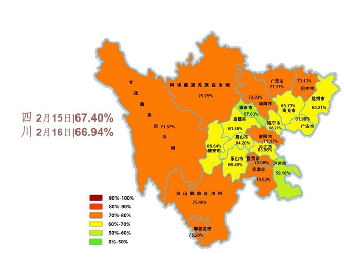 例如,2月15日0時至24時,全省共監(jiān)測10千伏及以上高壓供電企業(yè)113128戶,復工76253戶,較前日增加1359戶,復工率為67.4%,復產率為56.22%.而通過分地區(qū)來看,省內阿壩、廣元、攀枝花、自貢、涼山等市州復工企業(yè)超過了7成。