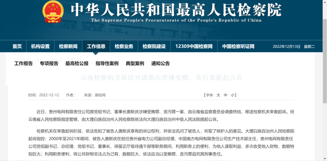 近日,貴州電網(wǎng)有限責(zé)任公司原黨組書記、董事長唐斯慶涉嫌受賄罪、貪污罪一案,由云南省監(jiān)察委員會(huì)調(diào)查終結(jié),移送檢察機(jī)關(guān)審查起訴。經(jīng)云南省人民檢察院指定管轄,由大理白族自治州人民檢察院依法向大理白族自治州中級(jí)人民法院提起公訴。