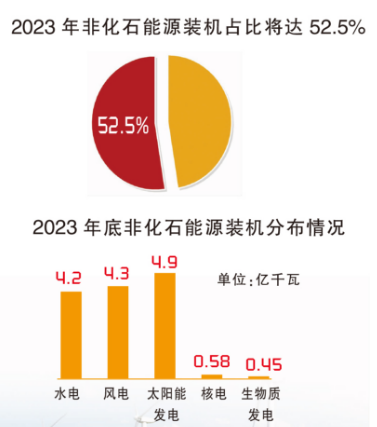 《報(bào)告》預(yù)計(jì),在新能源發(fā)電快速發(fā)展帶動(dòng)下,2023年新投產(chǎn)的總發(fā)電裝機(jī)以及非化石能源發(fā)電裝機(jī)規(guī)模將再創(chuàng)新高,其中全國新增發(fā)電裝機(jī)規(guī)模有望達(dá)到2.5億千瓦左右,新增非化石能源發(fā)電裝機(jī)1.8億千瓦。到2023年底,全國發(fā)電裝機(jī)達(dá)28.1億千瓦左右,非化石能源發(fā)電裝機(jī)合計(jì)14.8億千瓦,占總裝機(jī)比重上升至52.5%左右。其中,水電4.2億千瓦、并網(wǎng)風(fēng)電4.3億千瓦、并網(wǎng)太陽能發(fā)電4.9億千瓦、核電5846萬千瓦、生物質(zhì)發(fā)電4500萬千瓦左右,太陽能發(fā)電及風(fēng)電裝機(jī)規(guī)模將在2023年首超水電裝機(jī)規(guī)模 。