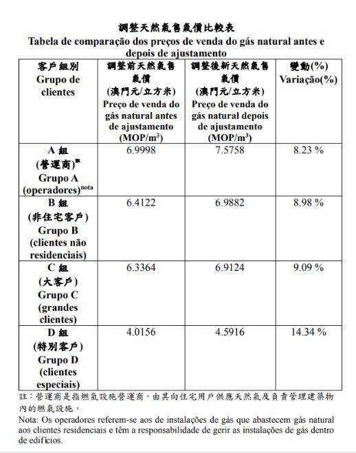 四個客戶組別的天然氣售氣價格將分別上調(diào)約8%至14%(詳見附表),其中住宅客戶(A組)為主要的天然氣用戶,預(yù)計每月平均用氣費(fèi)將增加約澳門元7.5元。