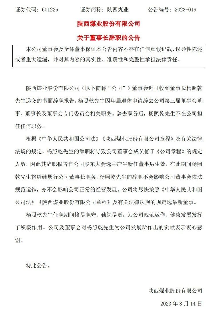 陜西煤業(yè)公告,公司董事會(huì)近日收到董事長(zhǎng)楊照乾遞交的書面辭職報(bào)告。楊照乾因年屆退休申請(qǐng)辭去公司第三屆董事會(huì)董事、董事長(zhǎng)及董事會(huì)專門委員會(huì)相關(guān)職務(wù)。