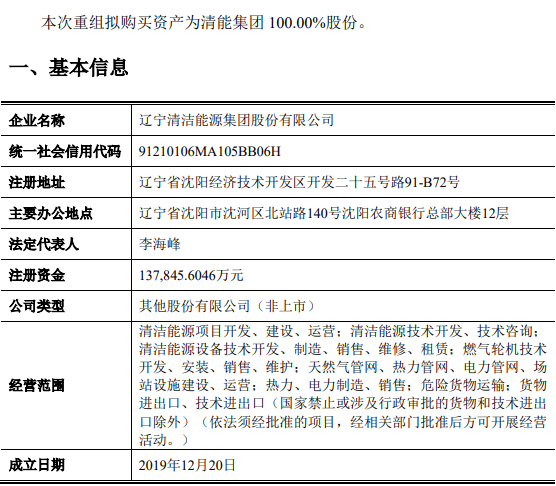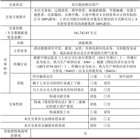 根據(jù)此前公告披露,遼寧能源擬作價18.17億元,以發(fā)行股份的方式收購遼能投資、港華投資、海通新能源等共8名投資者合計持有的遼寧清潔能源集團(簡稱:清能集團)100%股份,并募集配套資金10億元,用于遼能康平300MW風電項目、遼能南票200MW風電項目、償還上市公司債務。