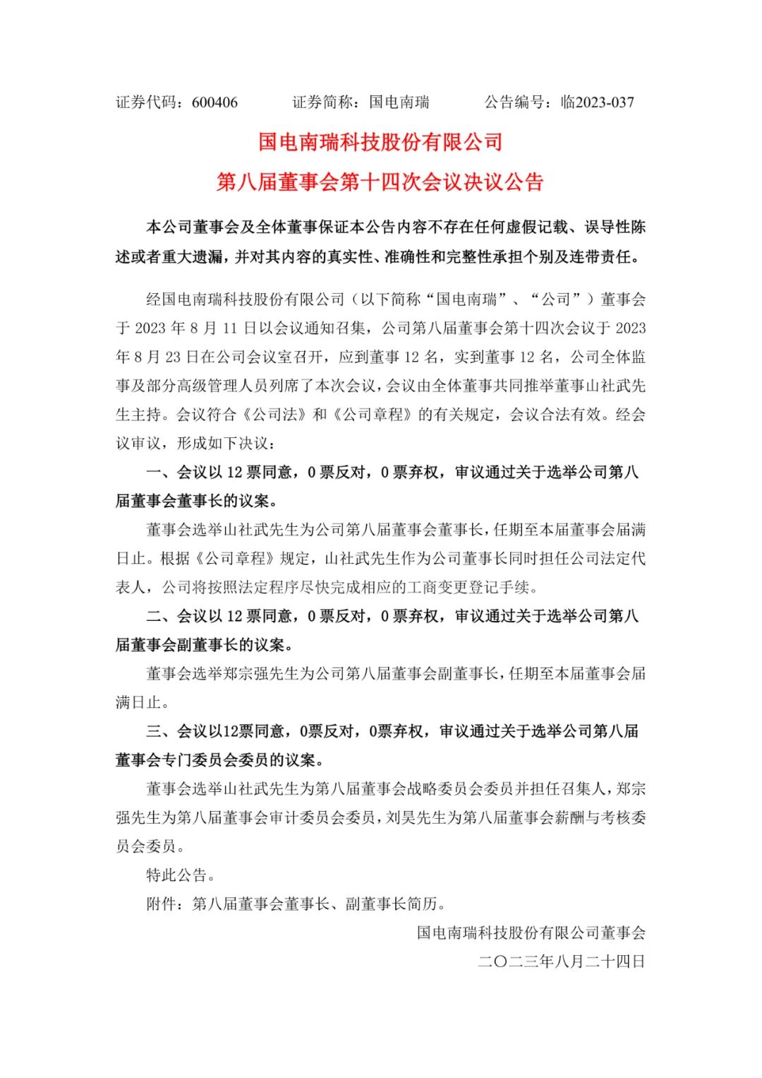 8月24日,國(guó)電南瑞發(fā)布公告稱(chēng),經(jīng)公司董事會(huì)于2023年8月11日以會(huì)議通知召集,公司第八屆董事會(huì)第十四次會(huì)議于2023年8月23日在公司會(huì)議室召開(kāi)。