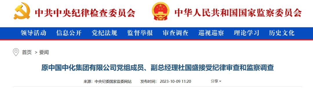 中央紀委國家監(jiān)委網(wǎng)站10月9日消息,據(jù)中國中化控股有限責(zé)任公司紀檢監(jiān)察組、福建省紀委監(jiān)委消息:原中國中化集團有限公司黨組成員、副總經(jīng)理杜國盛涉嫌嚴重違紀違法,目前正接受中國中化控股有限責(zé)任公司紀檢監(jiān)察組和福建省泉州市監(jiān)委紀律審查和監(jiān)察調(diào)查。