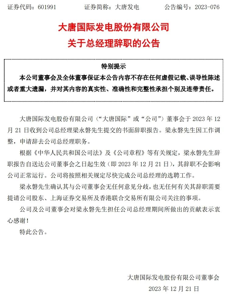 同日,大唐國際發(fā)布總經(jīng)理辭職公告,公司董事會收到總經(jīng)理梁永磐先生提交的書面辭職報告。梁永磐先生因工作調(diào)整,申請辭去公司總經(jīng)理職務。