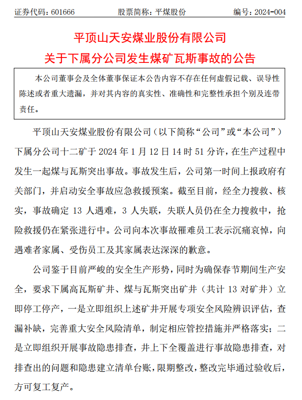 13人遇難3人失聯(lián) 平煤股份公告下屬煤礦瓦斯事故進(jìn)展