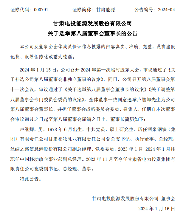 1月16日,甘肅能源發(fā)布公告,選舉盧繼卿先生為公司第八屆董事會(huì)董事長(zhǎng),并擔(dān)任董事會(huì)戰(zhàn)略委員會(huì)委員、召集人,任期自本次董事會(huì)審議通過(guò)之日起至第八屆董事會(huì)屆滿(mǎn)之日止。