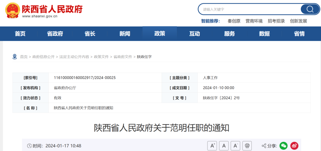 省政府2024年1月10日研究,同意范明為中陜核工業(yè)集團有限公司總經(jīng)理人選。