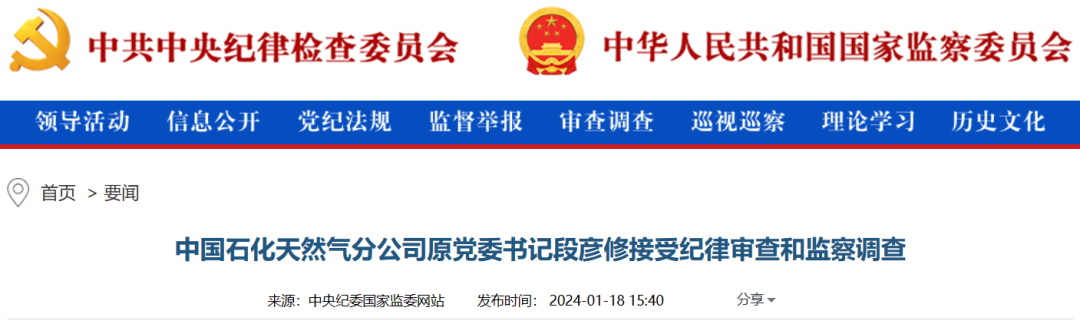 中央紀(jì)委國家監(jiān)委網(wǎng)站1月18日消息,據(jù)中國石化紀(jì)檢監(jiān)察組、山東省紀(jì)委監(jiān)委消息:中國石化天然氣分公司原黨委書記段彥修涉嫌嚴(yán)重違紀(jì)違法,目前正接受中國石化紀(jì)檢監(jiān)察組和山東省濱州市監(jiān)委紀(jì)律審查和監(jiān)察調(diào)查。