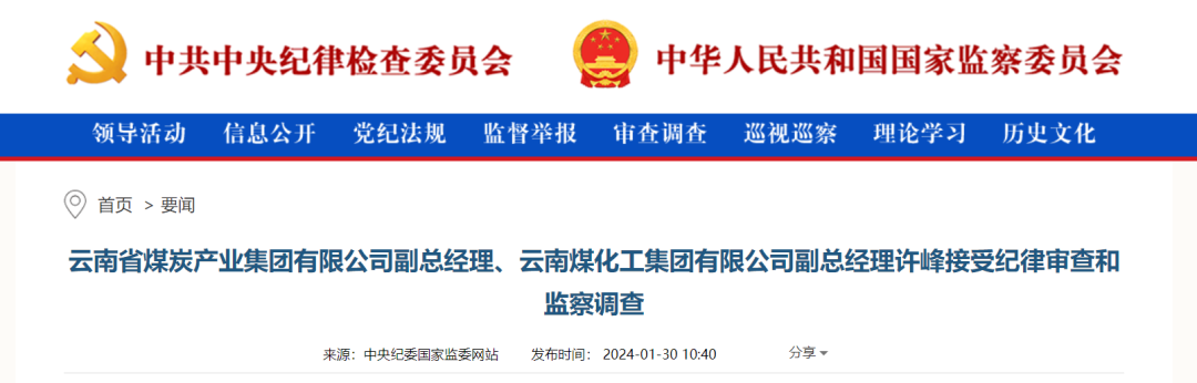 中央紀委國家監(jiān)委網(wǎng)站1月30日,據(jù)云南省紀委監(jiān)委消息:云南省煤炭產(chǎn)業(yè)集團有限公司副總經(jīng)理、云南煤化工集團有限公司副總經(jīng)理許峰涉嫌嚴重違紀違法,主動投案,目前正接受云南省紀委監(jiān)委紀律審查和監(jiān)察調(diào)查。