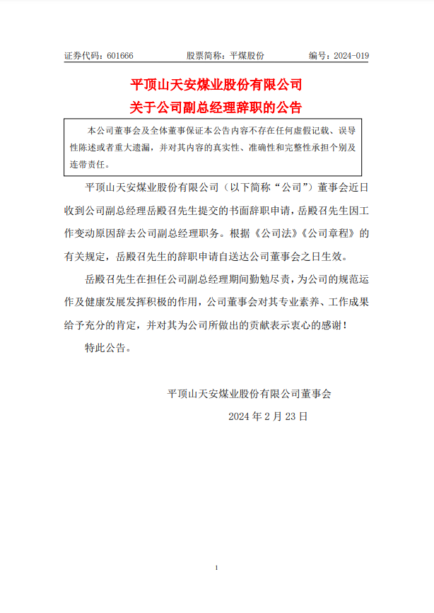 2月22日,平頂山天安煤業(yè)股份有限公司發(fā)布關(guān)于公司副總經(jīng)理辭職的公告。