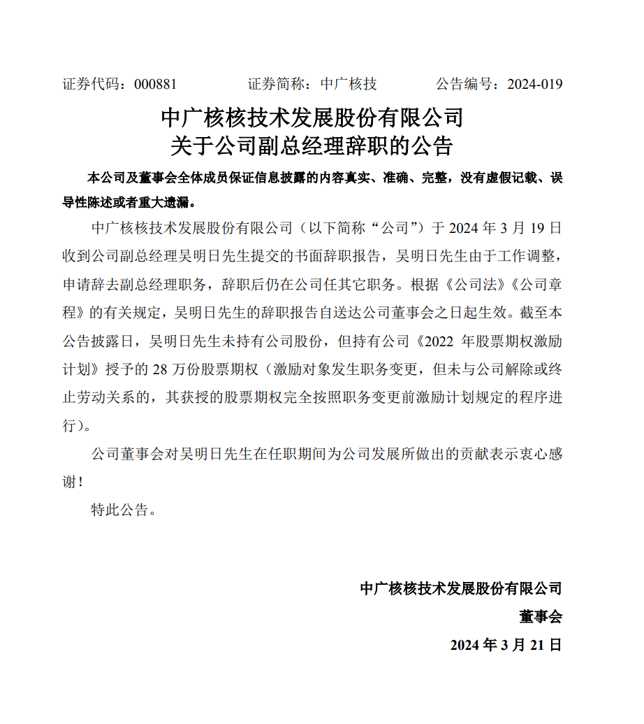 吳明日辭去中廣核核技術(shù)發(fā)展股份有限公司(以下簡稱“中廣核技”)副總經(jīng)理職務(wù)。