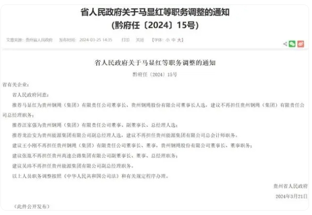 據(jù)貴州省人民政府網(wǎng)3月25日消息,貴州省人民政府發(fā)布關(guān)于馬顯紅等職務(wù)調(diào)整的通知。其中,推薦龍治安為貴州能源集團有限公司副總經(jīng)理人選,建議不再擔(dān)任貴州能源集團有限公司總會計師職務(wù)。建議吳瑋不再擔(dān)任貴州能源集團有限公司副總經(jīng)理職務(wù)。