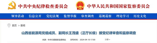 中央紀委國家監(jiān)委網站4月10日,據山西省紀委監(jiān)委消息:山西省能源局黨組成員、副局長王茂盛(正廳長級)涉嫌嚴重違紀違法,目前正接受山西省紀委監(jiān)委紀律審查和監(jiān)察調查。