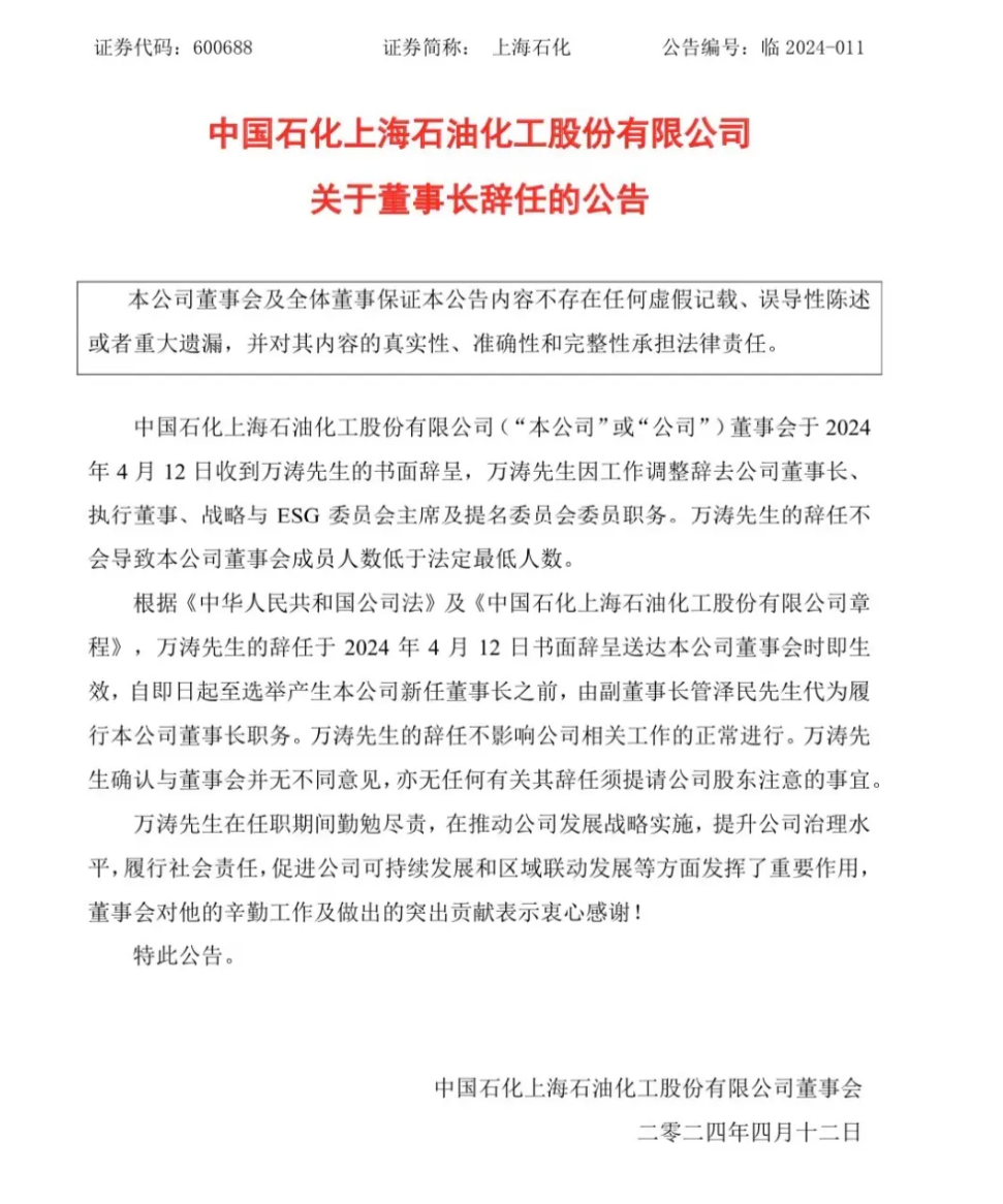 上海石化發(fā)布公告稱,公司董事會4月12日收到萬濤先生的書面辭呈,萬濤先生因工作調整辭去公司董事長、執(zhí)行董事、戰(zhàn)略與 ESG 委員會主席及提名委員會委員職務 。