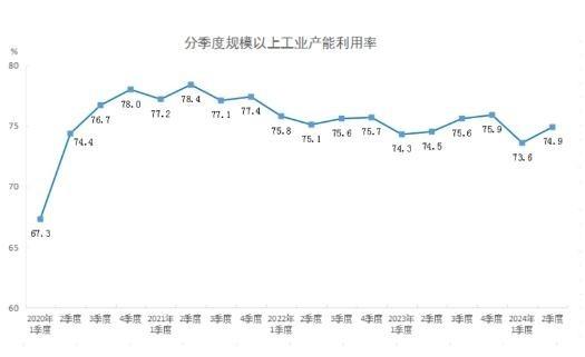 據(jù)國家統(tǒng)計局網(wǎng)站消息,2024年二季度,全國規(guī)模以上工業(yè)產(chǎn)能利用率為74.9%,比上年同期上升0.4個百分點,比一季度上升1.3個百分點。