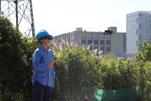 圖為工作人員應(yīng)用飛行眼鏡操控?zé)o人機(jī),對(duì)配電線路開展沉浸式巡線。