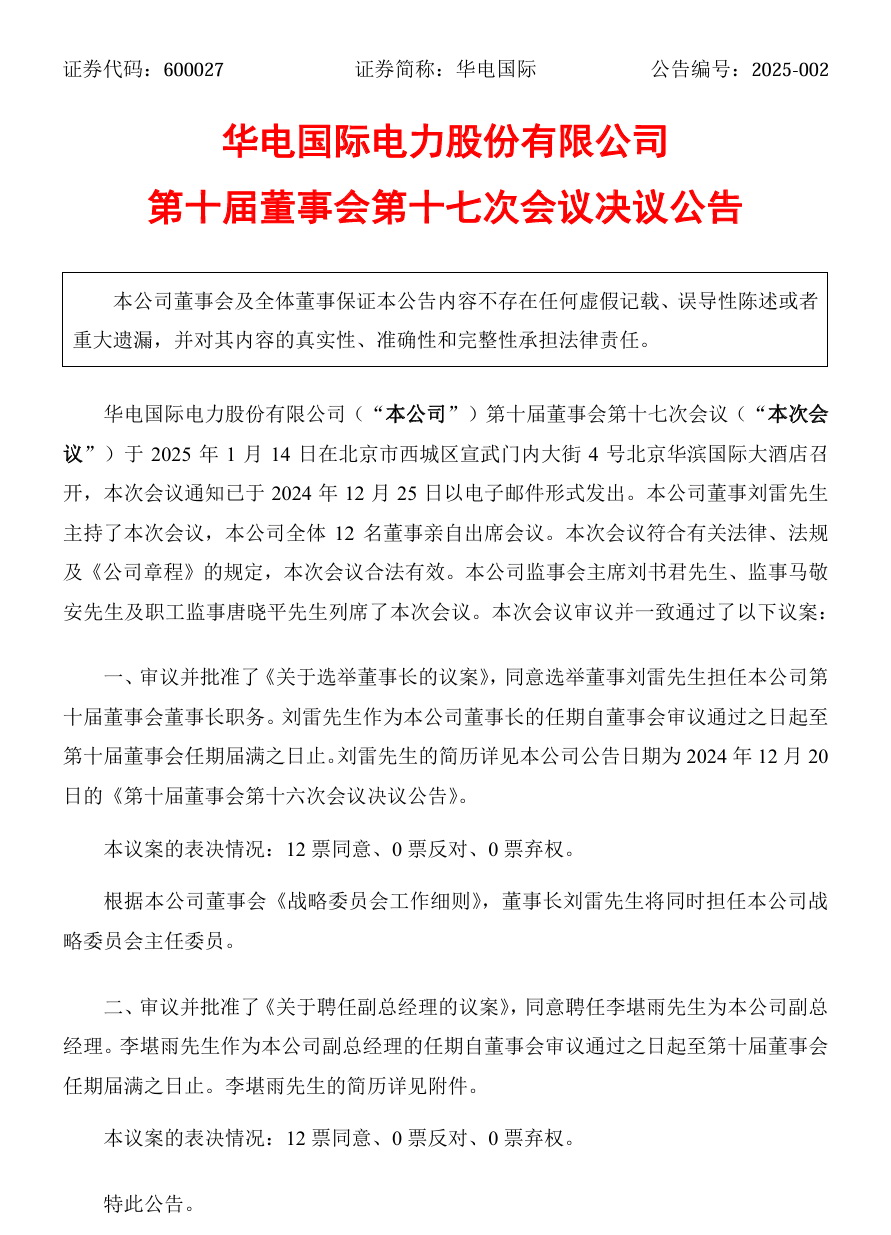 華電國際發(fā)布公告稱,公司第十屆董事會第十七次會議于1月14日召開。會議審議并批準了《關(guān)于選舉董事長的議案》,同意選舉董事劉雷先生擔(dān)任本公司第十屆董事會董事長職務(wù)。劉雷先生作為本公司董事長的任期自董事會審議通過之日起至第十屆董事會任期屆滿之日止。