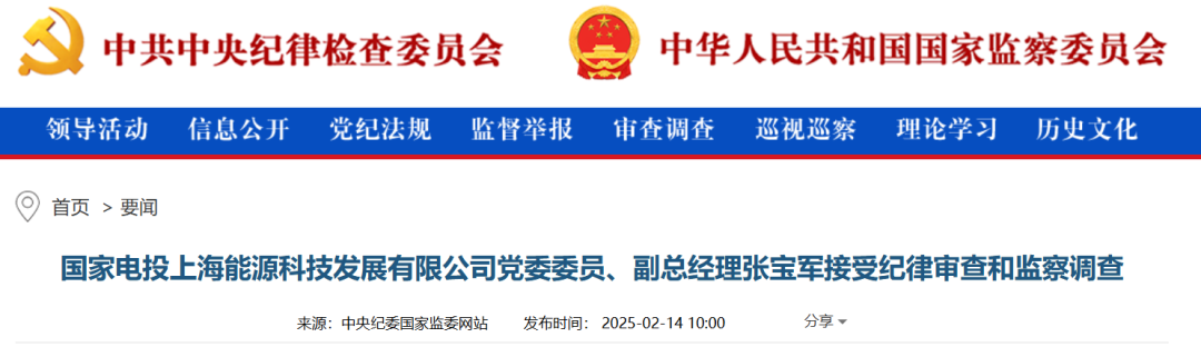 中央紀委國家監(jiān)委網(wǎng)站2月14日消息,據(jù)國家電投紀檢監(jiān)察組、山西省紀委監(jiān)委消息:國家電投上海能源科技發(fā)展有限公司黨委委員、副總經(jīng)理張寶軍涉嫌嚴重違紀違法,目前正接受國家電投紀檢監(jiān)察組和山西省長治市監(jiān)委紀律審查和監(jiān)察調(diào)查。