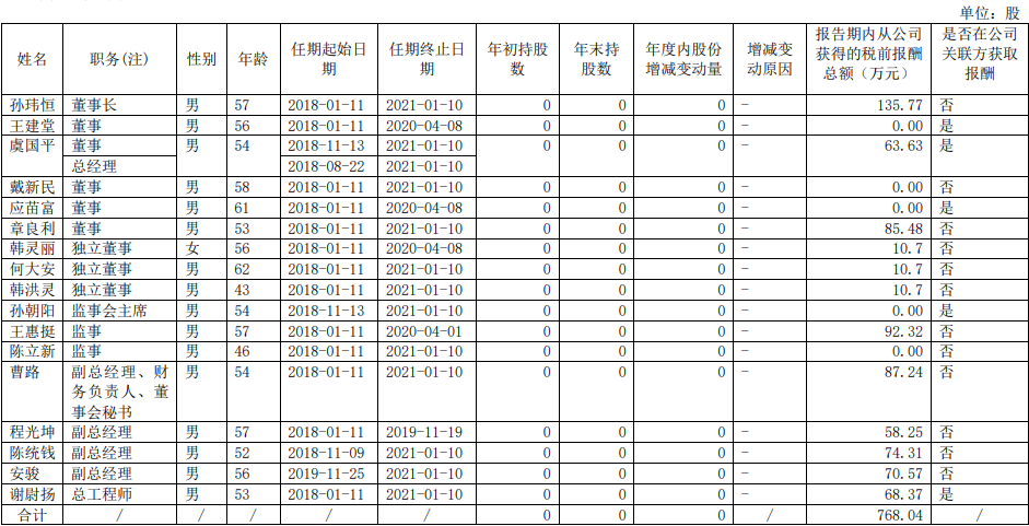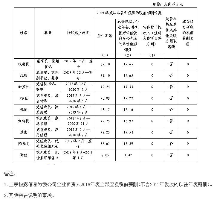 浙江浙能電力股份有限公司企業(yè)負責人2019年度薪酬情況