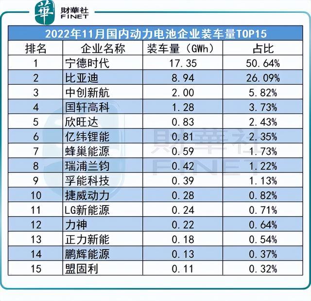 以2022年1-11月的單月市占率來看,寧德時代多次低于50%,但在2022年11月動力電池市占率又重回50%以上(排名如下表所示,來源:中國汽車動力電池產(chǎn)業(yè)創(chuàng)新聯(lián)盟)。